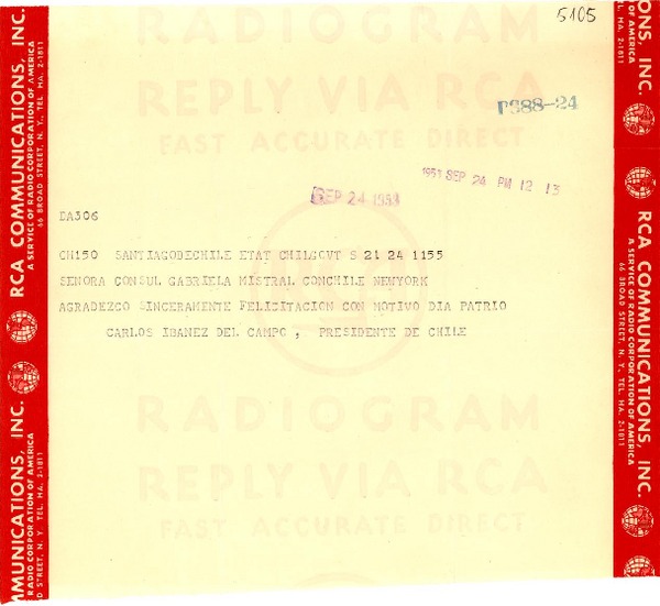 [Telegrama] 1953 sept. 24, Santiago, Chile [a] Gabriela Mistral, New York [manuscrito] Carlos Ibáñez del Campo.