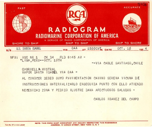 [Telegrama] 1954 oct. 10, Lima, Perú [a] Gabriela Mistral, Vapor Santa Isabel [manuscrito] Carlos Ibáñez del Campo.