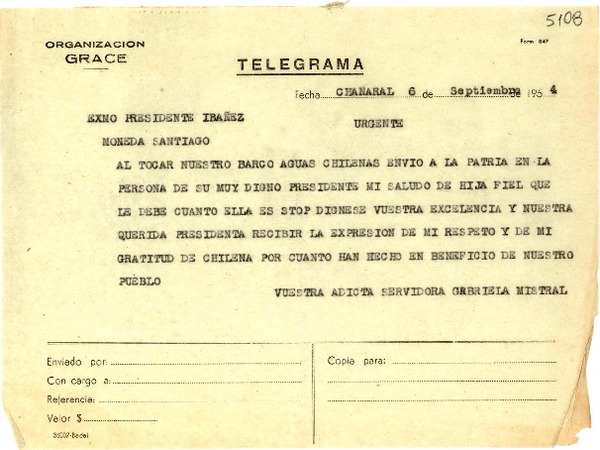 [Telegrama] 1954 sept. 6, Chañaral [a] Presidente Ibañez, Santiago [manuscrito] Gabriela Mistral.