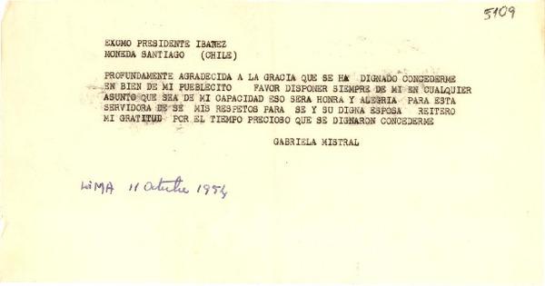 [Telegrama] 1954 oct. 11, Lima [a] Presidente Ibañez, Santiago, Chile [manuscrito] Gabriela Mistral.