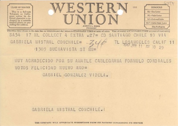 [Telegrama] 1947 ene. 11, Santiago, Chile [a] Gabriela Mistral, Los Angeles, Calif., [EE.UU.] [manuscrito] Gabriel González Videla.
