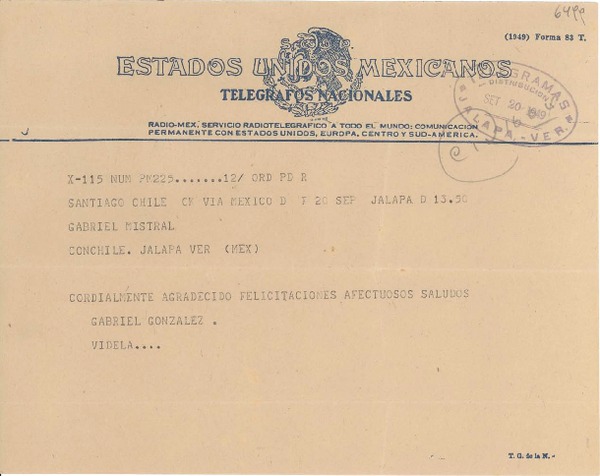 [Telegrama] 1947 sept. 20, Santiago, Chile [a] Gabriela Mistral, Jalapa, [México] [manuscrito] Gabriel González [Videla].
