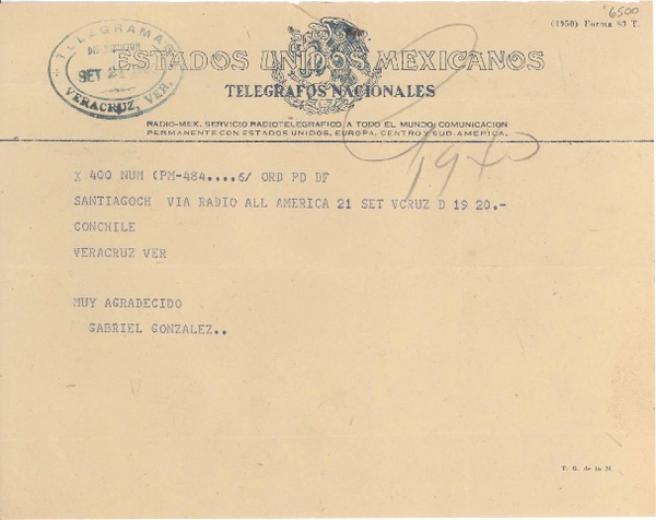 [Telegrama] 1950 sept. 21, Santiago, Chile [a] [Gabriela Mistral], Veracruz, [México] [manuscrito] Gabriel González [Videla].