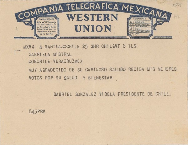 [Telegrama] Santiago, Chile [a] Gabriela Mistral, Veracruz, [México] [manuscrito] Gabriel González Videla.
