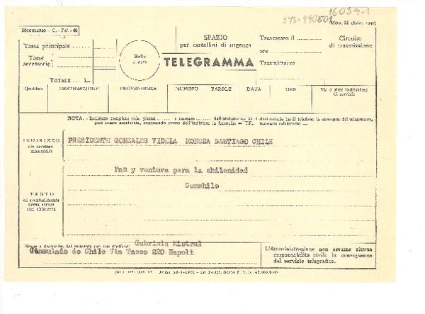 [Telegrama] 1952 set. 18, Consulado de Chile, Napoli, [Italia] [a] Presidente [Gabriel] González Videla, [La] Moneda, Santiago, Chile [manuscrito] Gabriela Mistral.