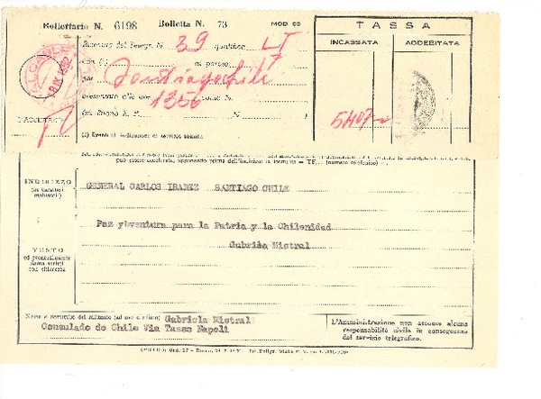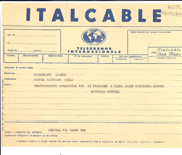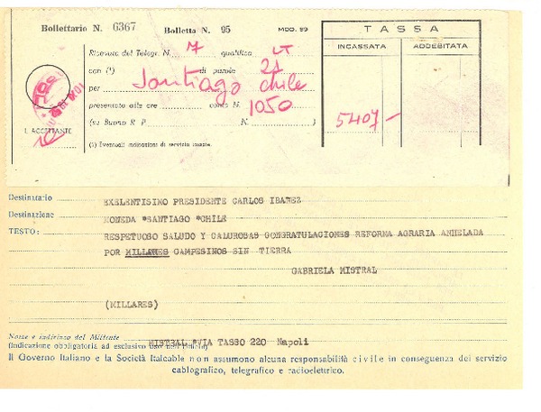 [Telegrama] [1952?], [Nápoles, Italia] [a] Presidente [Carlos] Ibañez [del Campo], [La] Moneda, Santiago, Chile [manuscrito] Gabriela Mistral.