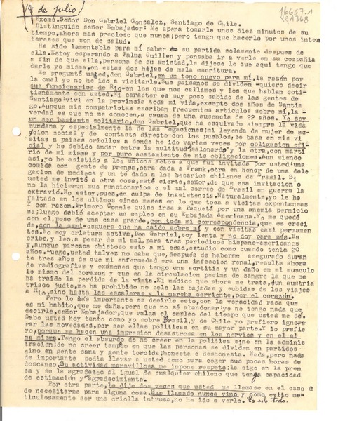 [Carta] 1936 jul. 3, Santiago [a] Gabriela Mistral [manuscrito] Arturo Alessandri Palma.