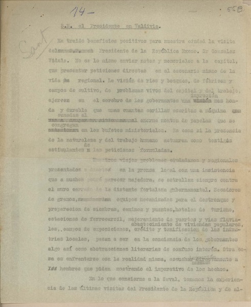 S.E. el Presidente en Valdivia [manuscrito] Fernando Santiván.