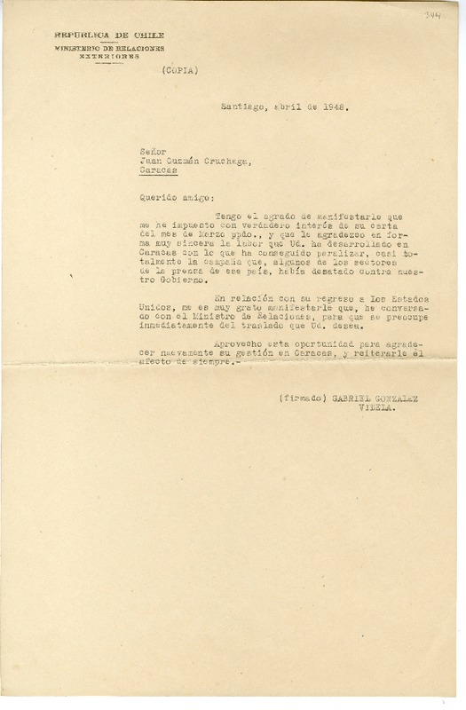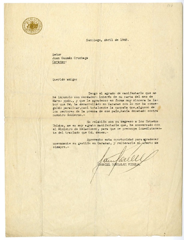 Mujica, Juan - Correspondencia - Autores chilenos - Manuscritos chilenos - González Videla, Gabriel