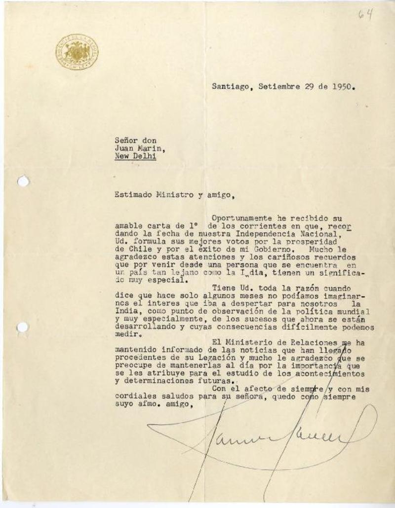 [Carta] 1935 oct. 16, Santiago, [Chile] [a] Emelina de Barraza, La Serena, [Chile] [manuscrito] Pedro Aguirre Cerda.