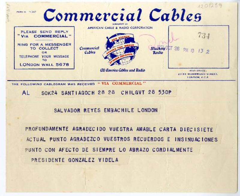 Santiago, Chile [a] Salvador Reyes, Londres, Inglaterra Telegrama, 1952 octubre 28, [manuscrito] Gabriel González Videla.