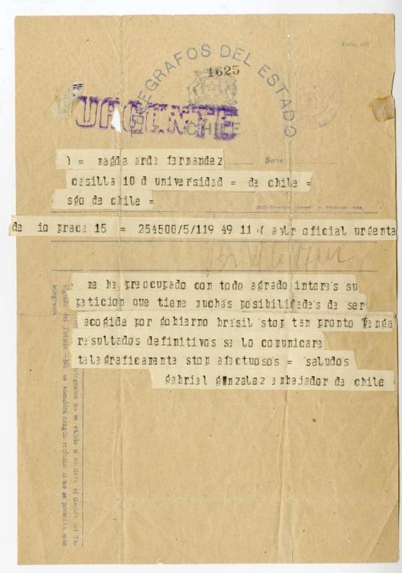 Brasil [a] Magda Arce Fernández, Universidad de Chile Telegrama, 1949, [manuscrito] Gabriel González Videla.