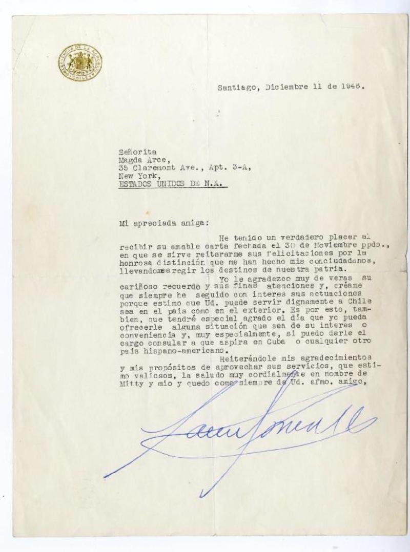 Santiago, Chile [a] Magda Arce, New York Carta, 1946 , [manuscrito] Gabriel González Videla.