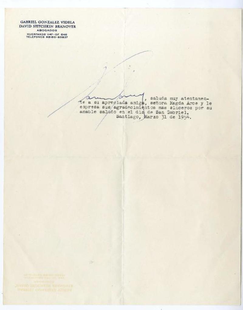 Santiago, Chile [a] Magda Arce. Carta, 1954 , [manuscrito] Gabriel González Videla.