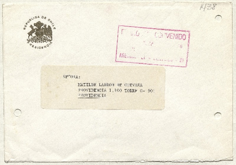 [Carta] 1964 julio 26, Santiago de Chile [a] Señor Presidente de la República de Chile Don Jorge Alessandri Rodriguez [manuscrito] Matilde Ladrón de Guevara.