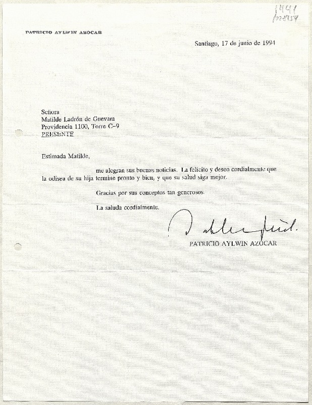 [Carta] 1994 junio 17, Santiago, Chile [a] Matilde Ladrón de Guevara [manuscrito] Patricio Aylwin Azócar.