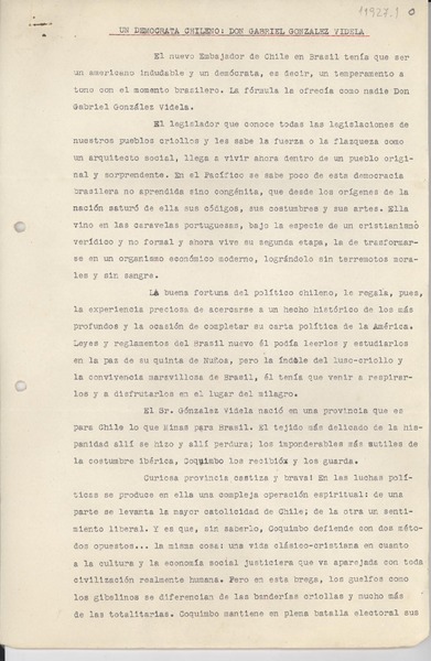 Um democrata chileno d. Gabriel González Videla [artículo] : Gabriela Mistral.