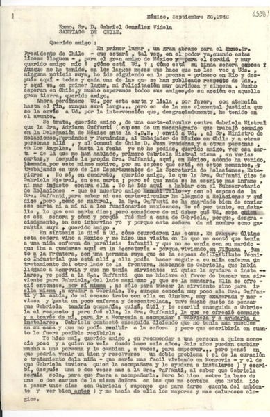 [Carta] 1946 sept. 30, México [a] Gabriel González Videla, Santiago [manuscrito] Palma Guillén.