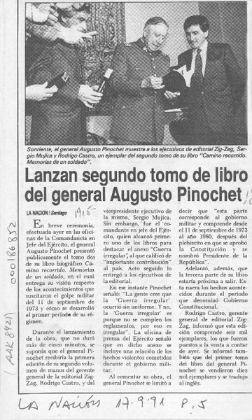 Lanzan segundo tomo de libro del general Augusto Pinochet [artículo].