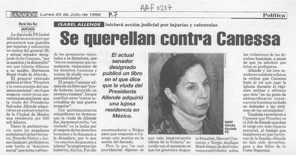 Se querellan contra Canessa [artículo] María Inés Ruz.