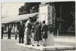 Entrega de ofrenda floral en acto de conmemoración del aniversario de fallecimiento de don Pascual Baburizza Soletic, Instituto Agricola Pascual Baburizza, Hacienda San Vicente, Calle Larga, Chile.