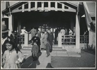 Habitantes y autoridades en el complejo para trabajadores de la Hacienda San Vicente [Fotografía]. Chile : [Editor no identificado] , [1954]. 3 Fotografías : Formato digital. .
