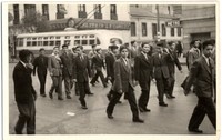 Grupo de jovenes aparece en la fotografía marchando-protestantdo por la Avenida Argentina en el plano de Valparaíso. De fondo, se observa un trole y se divisa el nombre de la "Zapatería La Condal".