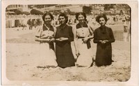 Fotografía de cuatro mujeres arrodilladas en la playa de Cartagena. De fondo se aprecian las tiendas y parte de las construcciones aledañas.