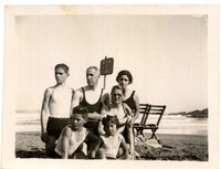 [Familia en playa chica de Cartagena] [fotografía]. [Chile] : [entre 1920 y 1930]. 1 fotografía monocromo, gelatina sobre papel fibra ; 7 x 9 cm. .