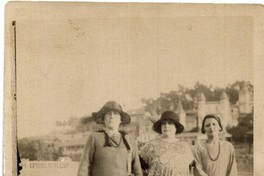 Tres mujeres con sombreroen la Playa Chica de Cartagena. Al fondo la Iglesia "maldita" del balneario.