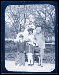 [Familia en plaza Vergara] [fotografía]. [Chile] : [entre 1940 y 1950]. 1 fotografía : negativo sobre papel ; 9 x 7 cm .