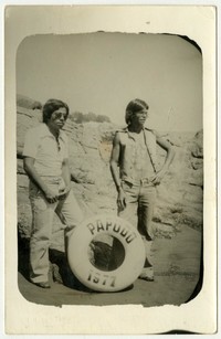 [Jovenes con salvavida en Papudo] [fotografía]. Papudo : 1977. 1 fotografía : monocromo, gelatina sobre papel fibra ; 14 x 9 cm .