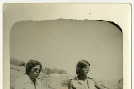 Dos jovenes con lentes en un roquerío en el balneario con un neumático salvavidas donde se lee "Papudo 1977".