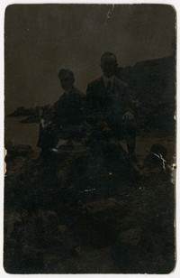 [Hombres en roquerío de un balneario] [fotografía]. Valparaíso : 1917. 1 fotografía : monocromo, gelatina sobre papel fibra ; 11 x 7 cm .