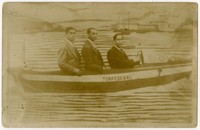 Tres hombres aparecen en la fotografía detrás de bote en el que se lee "Torpederas", pintado en telón de fondo, en el que además se observa un muelle y una embarcación de fondo.