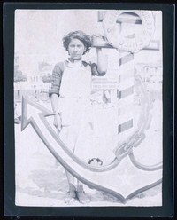 [Niña adolescente detrás de imitación de ancla en balneario de Cartagena] [fotografía]. Cartagena : 1950. 1 fotografía : negativo sobre papel ; 9 x 7 cm .