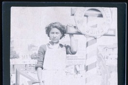 Muchacha de pie detrás de imitación de ancla, de la que pende un salvavida en el que se lee "Balneario Cartagena Chile 1950".