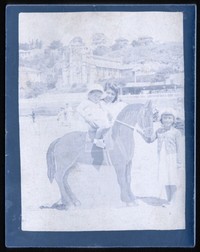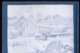 Mujer adulta, aparece en la fotografía sosteniendo a niño pequeño con sombrero, que está sentado en poni pintado sobre cartón o madera, y quienes aparecen retratados junto a niña con boina, que sostiene desde adelante las riendas. De fondo, la Iglesia del Niño Jesús de Cartagena.