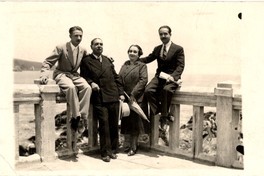 Mujer con sombrilla cerrada y hombre que sostiene su sombrero y un periódico, aparecen en la fotografía de pie junto a dos hombres menores que están sentados en mirador de balneario que, presumiblemente se trate de San Antonio.