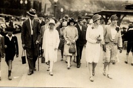 Grupo de mujeres y hombres con sombrero y niños con boina, aparecen en la fotografía caminando frente a Playa Miramar de Viña del Mar.