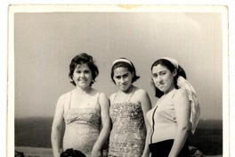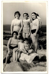 Mujeres adultas y jóvenes aparecen en la fotografía sobre roquerío de balneario de Papudo con trajes de baño, al igual que los niños que aparecen sentados sobre una toalla.