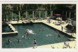 [Piscina de agua termal, rodeada de jardines, en el Hotel Balneario Jahuel] [fotografía] / Hotel Balneario Jahuel, Chile [San Felipe] : Hotel Balneario Jahuel , [Entre 1950 y 1960]. 1 tarjeta postal : fotografía, policromo gelatina sobre papel ; 14 x 9 cm. .