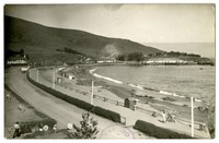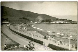 [Papudo: Vista de la playa, costanera y edificaciones orientadas hacia el mar; fotógrafo minutero observa desde la terraza] [fotografía] / Foto Callejas. Papudo : Foto Callejas , 1943. 1 tarjeta postal : fotografía, monocromo gelatina sobre papel ; 13,8 x 8,8 cm. .