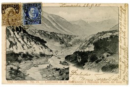 Viaje Cordillera. N° 24.- Confluente de los Ríos Cuevas y Horcones (Puente del Inca) [fotografía] / Carlos Brandt. Santiago : Carlos Brandt , [Entre 1900 y 1909]. 1 tarjeta postal : colotipo, fotomecánico monocromo sobre papel ; 10 x 8,8 cm. .