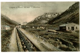 Llegada a Puente del Inca - Mendoza [Via férrea con cremallera ABT, para el paso del ferrocarril] [fotografía] / Humberto Bertoletti Argentina : Humberto Bertoletti , [entre 1900 y 1909]. 1 tarjeta postal : colotipo, fotomecánico policromo sobre papel ; 13,8 x 8,8 cm. .