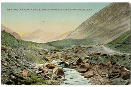 Rep. Arg. Camino a Chile desde Punta de Las Vacas Cordillera [fotografía]. Argentina : [Editor no identificado , 19uu]. 1 tarjeta postal : medio tono, fotomecánico policromo sobre papel ; 13,8 x 8,8 cm. .