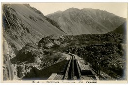R. A. Cordillera, Cremallera : [En el trazado de la vía ferroviaria Los Andes-Mendoza, se construyeron 22 kms. de vías con cremallera ABT en Chile y 13 kms. en Argentina; se utilizó un sistema de zigzag para el difícil tramo de Zanjón Amarillo] [fotografía] / Colección Fajardo. Mendoza : Colección Fajardo , [entre 1915 y 1925]. 1 tarjeta postal : fotografía, monocromo gelatina sobre papel ; 13,5 x 8,4 cm. .