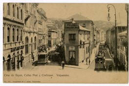 Cruz de Reyes, Calles Prat y Cochrane. Valparaiso [fotografía] / J. Allan. Valparaíso : J. Allan , [Entre 1910 y 1919]. 1 tarjeta postal : colotipo, fotomecánico monocromo sobre papel ; 13,7 x 8 cm. .