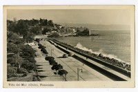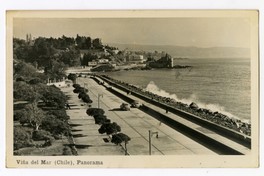 Viña del Mar (Chile), Panorama : [Borde Costero, Avenida Marina; el Castillo Wulff y el Hotel Restaurante Cap Ducal, al fondo, el Hotel Miramar] [fotografía]. Chile : [Editor no identificado , Entre 1939 y 1950]. 1 tarjeta postal : fotografía, monocromo, gelatina sobre papel fibra ; 14 x 9 cm. .