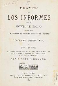 Examen de los Informes sobre el Sistema de equipo pasados por la Administración del Ferrocarril entre Santiago y Valparaíso al Consejo directivo / Carlos F. Hillman. Santiago : Imprenta de la Librería de Mercurio, 1874. 154 páginas ; 25 cm. .